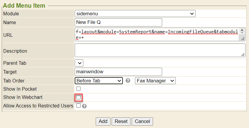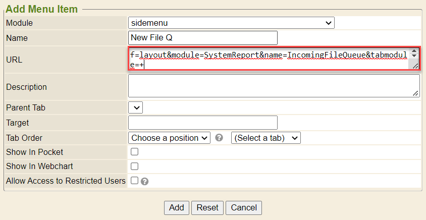 1. Add the URL - ?f=layout&module=SystemReport&name=IncomingFileQueue&tabmodule=+