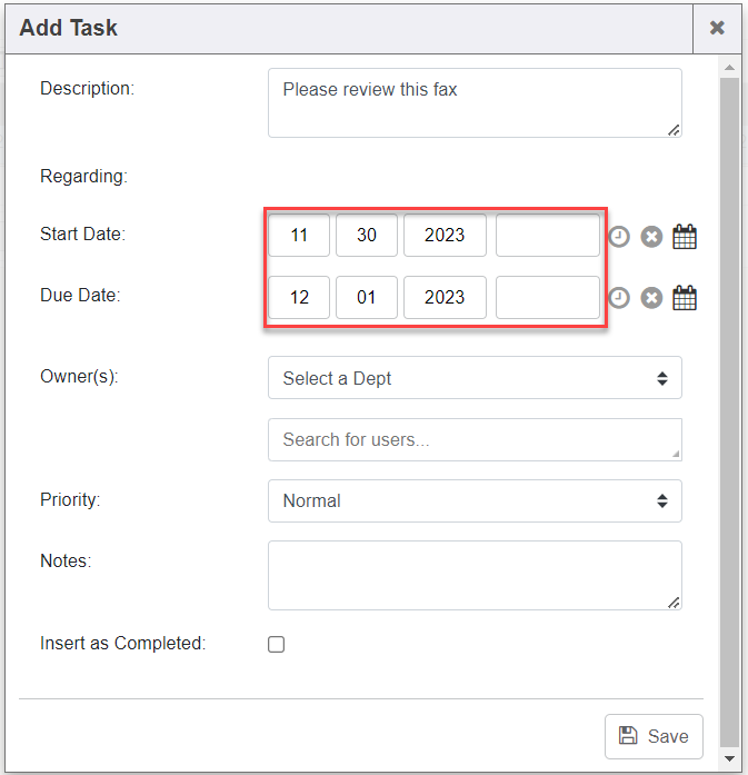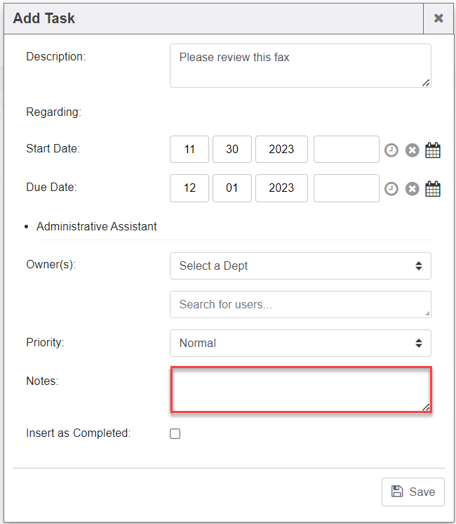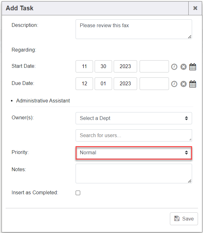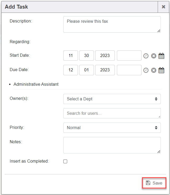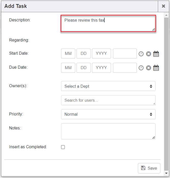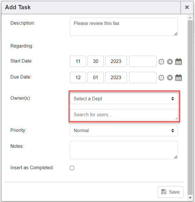 1. Click “Add Task” button to task a department or user within the system