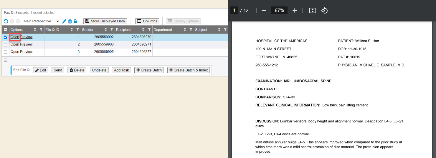 The File/Fax Queue allows for viewing/indexing of incoming faxes. Within the module, a file can be previewed or opened, tasks generated, file sent to a new user or department, or indexed directly within the queue or WebScan. This module has recently been updated to now include additional information when opening the file. When a user opens the file, they will see a summary of that document. The summary includes the File ID, Date and Time it was created in the queue, the Sender’s fax number, and the status. When a user hovers over this information, a set of shortcut icons are displayed. The icons will be reviewed in the Documentation section. The File/Fax Queue is a feature that can be added or upgraded for an additional cost.