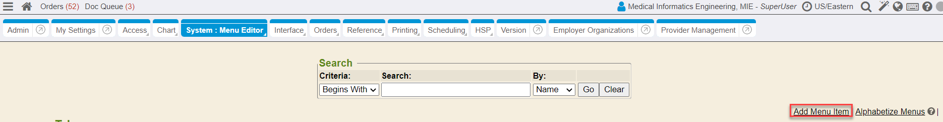 1. From the Control Panel on the left side menu, click on the System chart tab and then click on the Menu Editor sub-tab