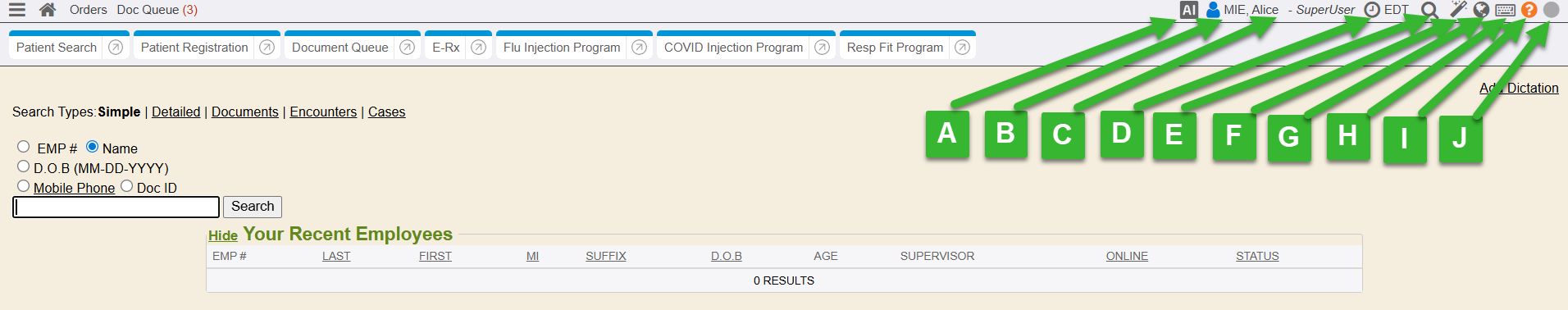 F. Encounter info toolbar: Displays links to open encounters while working in an E-chart or encounter.